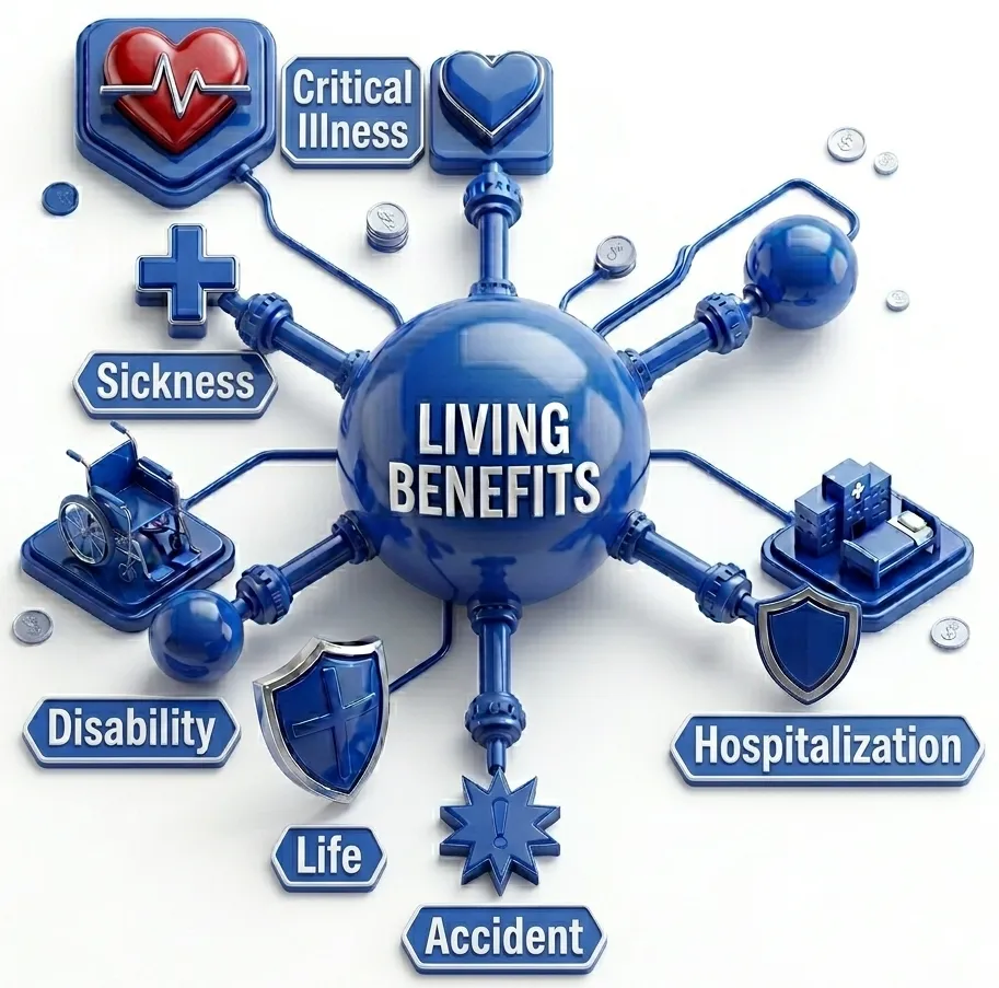 Living Benefits life insurance is designed to provide financial protection not only for your loved ones after death, but also for you while you are living. Certain policies allow access to a portion of the policy benefits if serious health conditions occur, such as critical or terminal illnesses. This type of protection can help reduce financial pressure during challenging times by supporting medical expenses, protecting income, and maintaining financial stability while you focus on recovery.